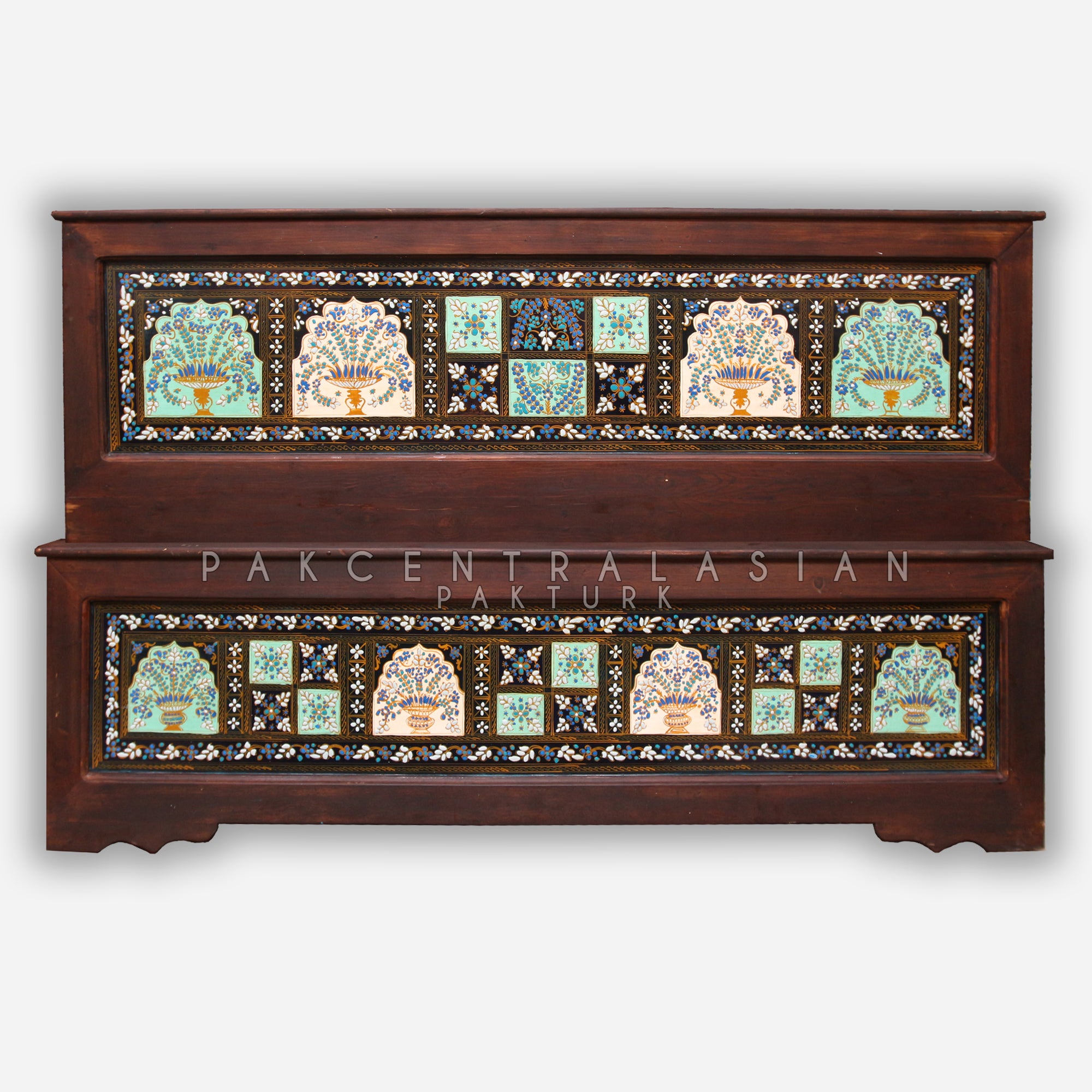 The Mughlai Wooden Bed Turquoise features intricate hand-carved details and a vibrant turquoise finish, combining traditional craftsmanship with modern durability. This luxurious bed serves as a striking centerpiece for any bedroom.