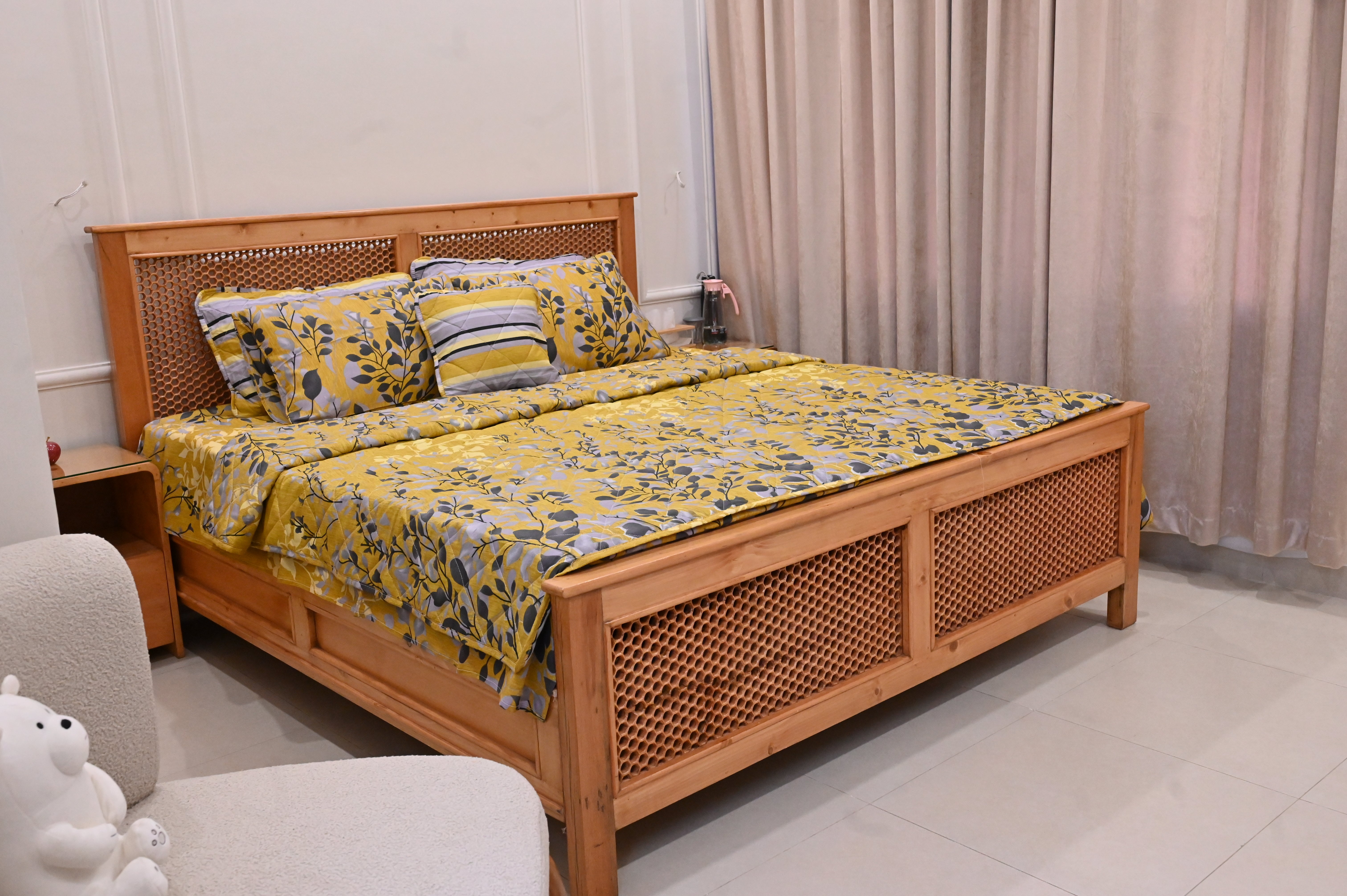The Wooden Jaali Bed combines traditional craftsmanship with functional design, featuring a beautifully carved Jaali (lattice) pattern and solid wood construction. Paired with matching side tables, this bed adds timeless elegance and a warm, inviting feel to your bedroom — perfect for both modern and classic interiors.